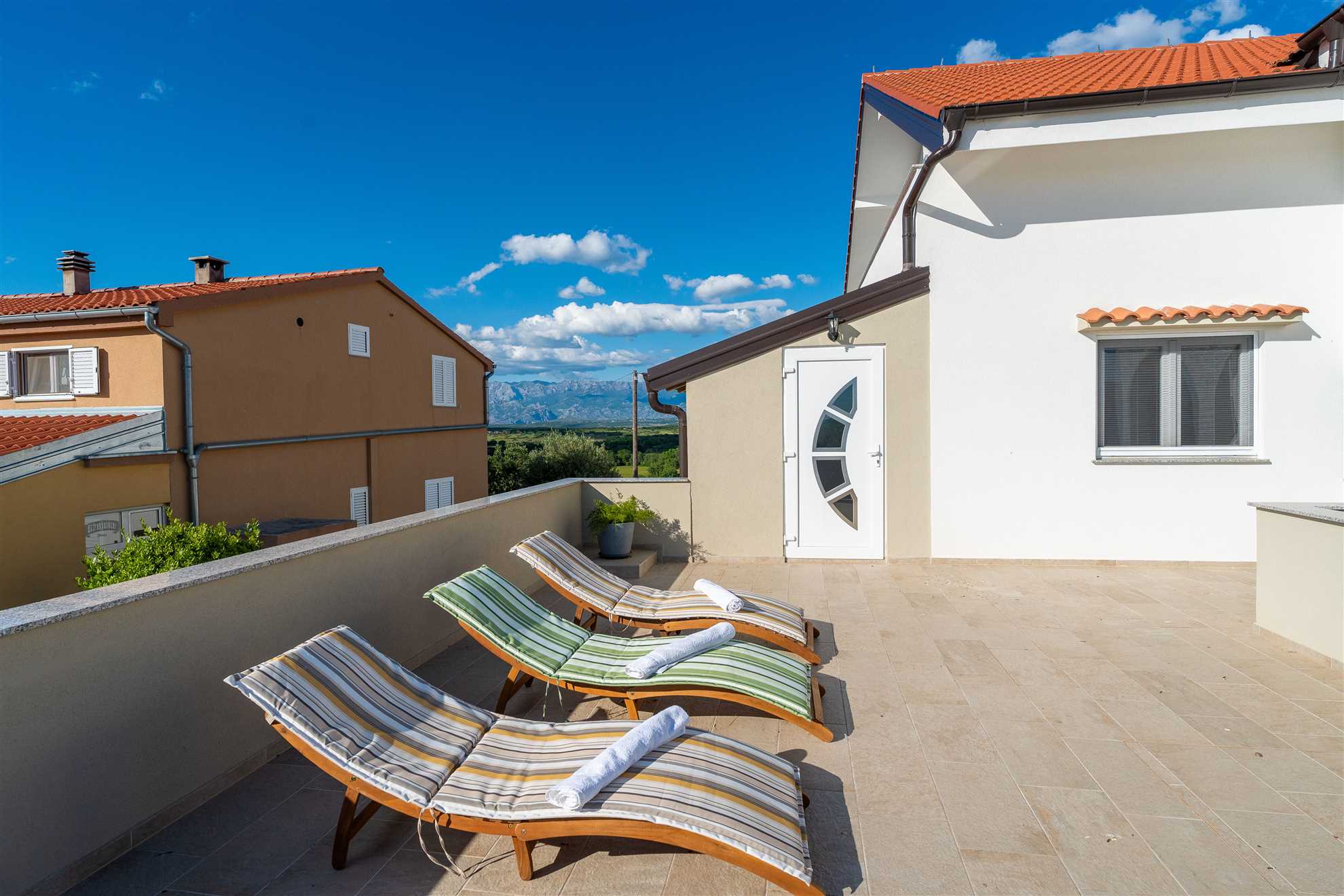 Outside, the terrace offers a peaceful retreat for relaxation and enjoyment. A barbecue stands ready for al fresco dining experiences, while sun loungers invite guests to bask in the warm Croatian sun amidst verdant greenery.