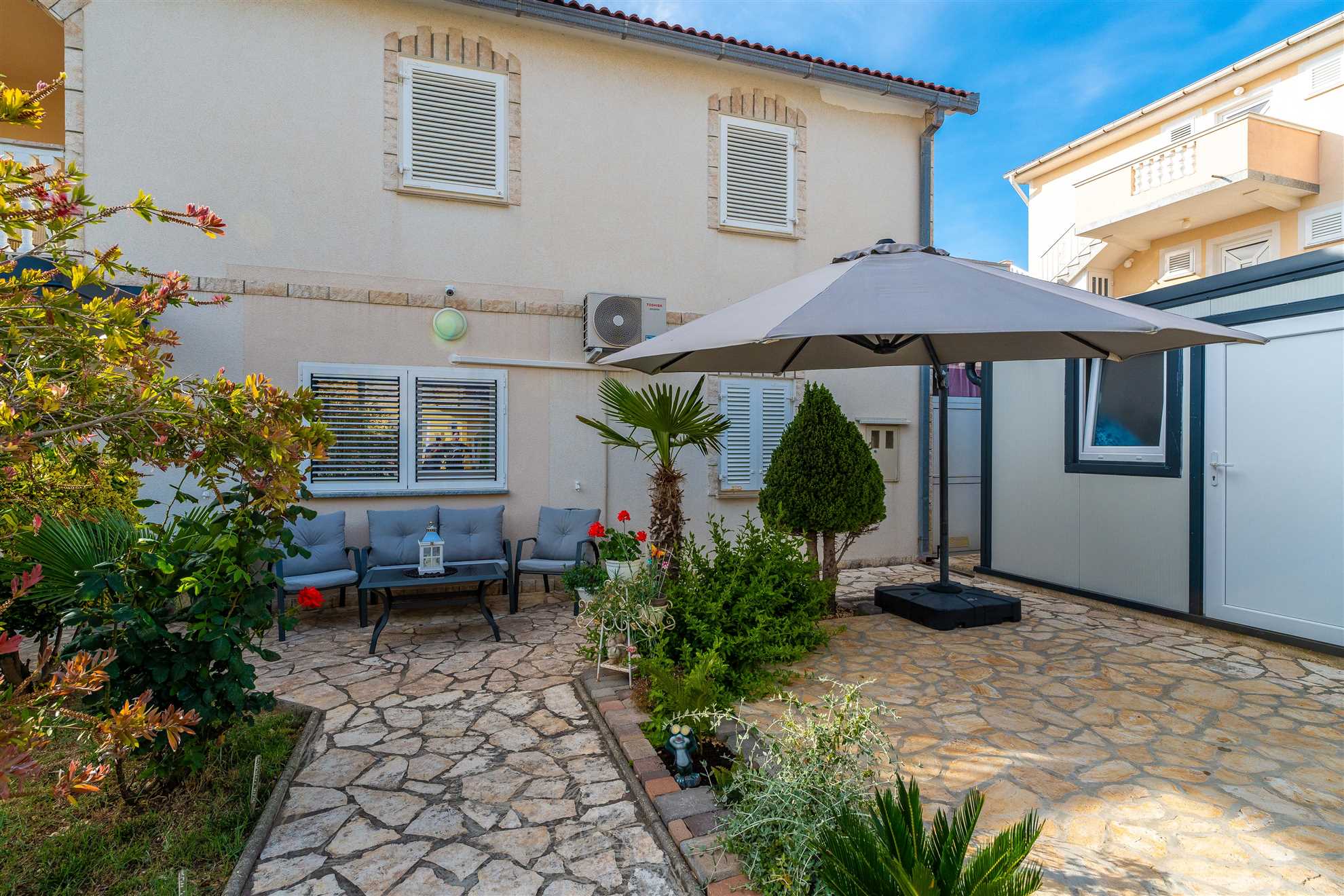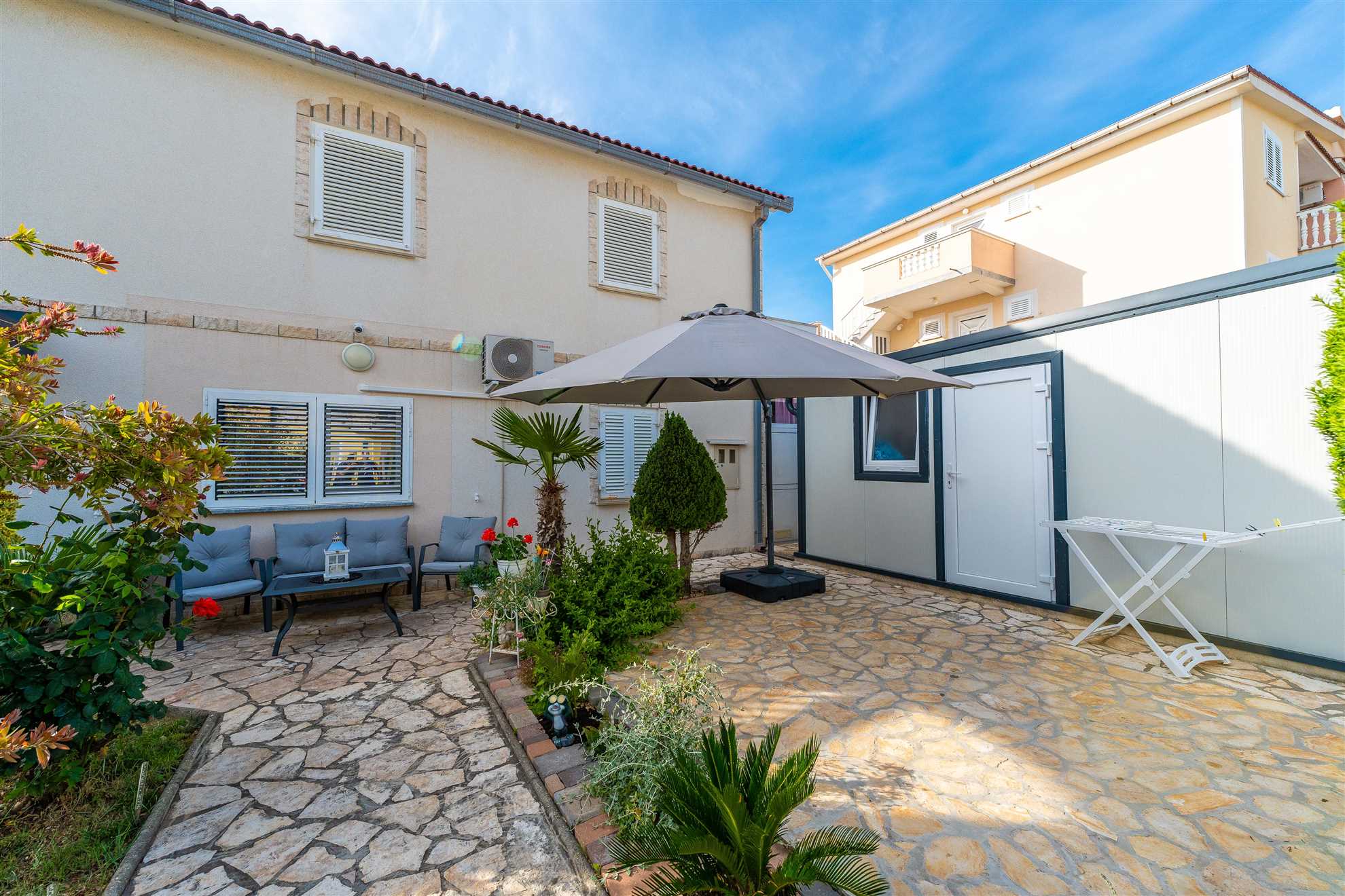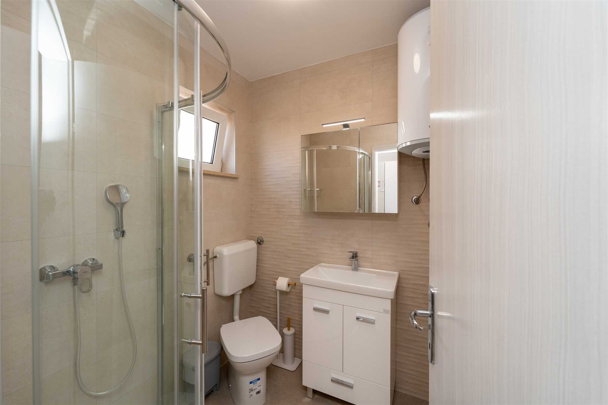 Esci e scopri la nostra oasi nel giardino, completa di un'accogliente area salotto e un barbecue, perfetta per cenare all'aperto e socializzare sotto il sole croato. Il bagno dell'appartamento incarna la raffinatezza minimalista, dotato di servizi di fascia alta per soddisfare le vostre esigenze personali.