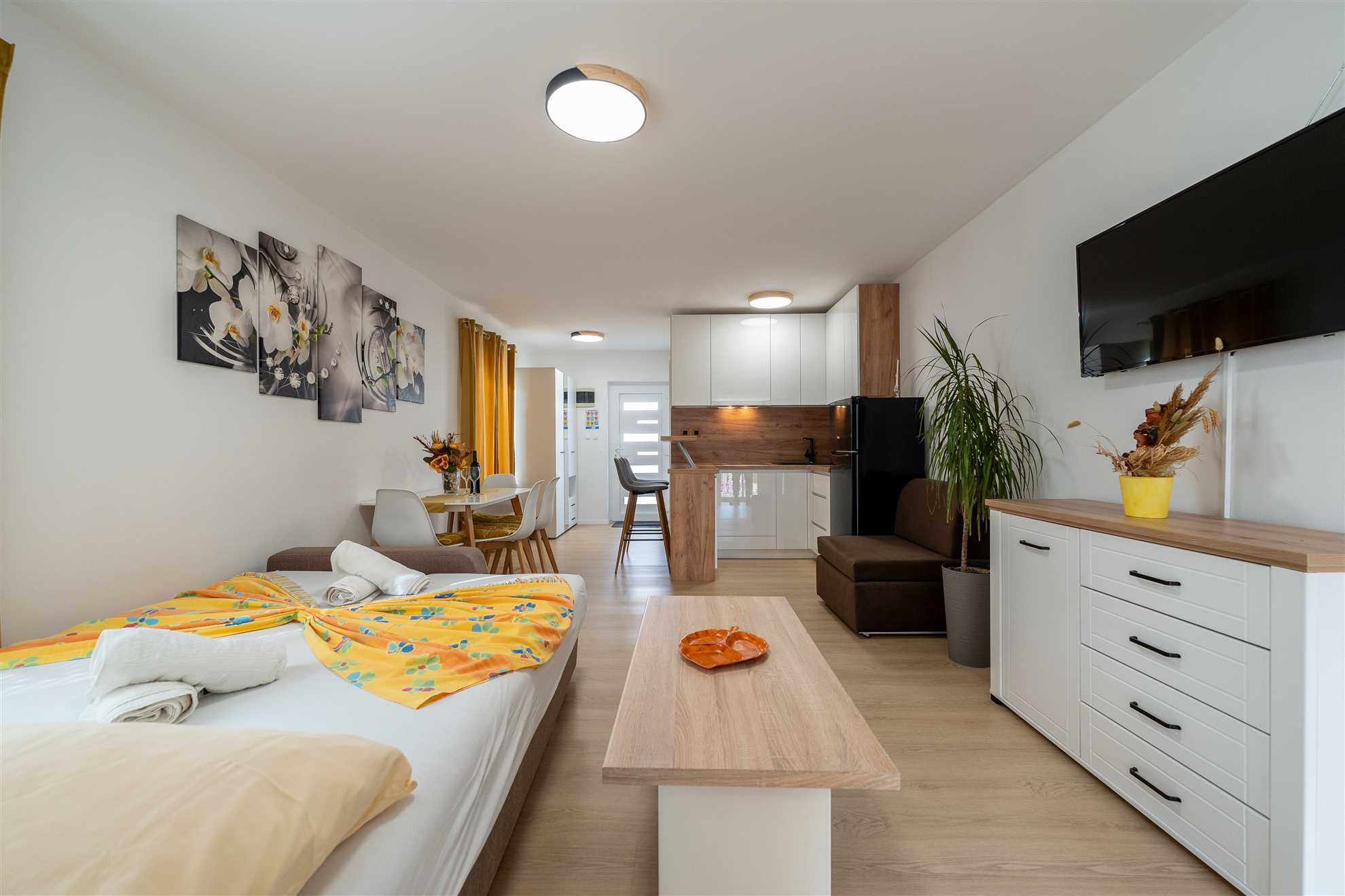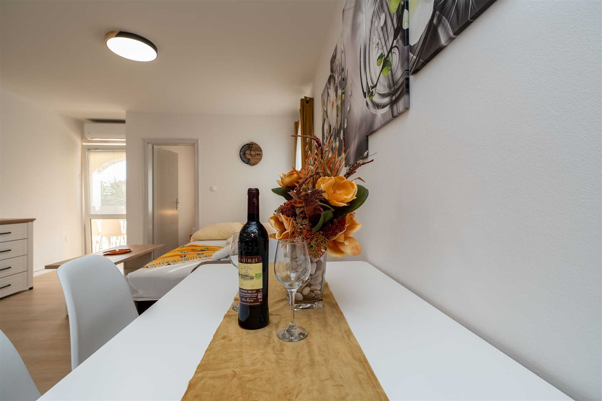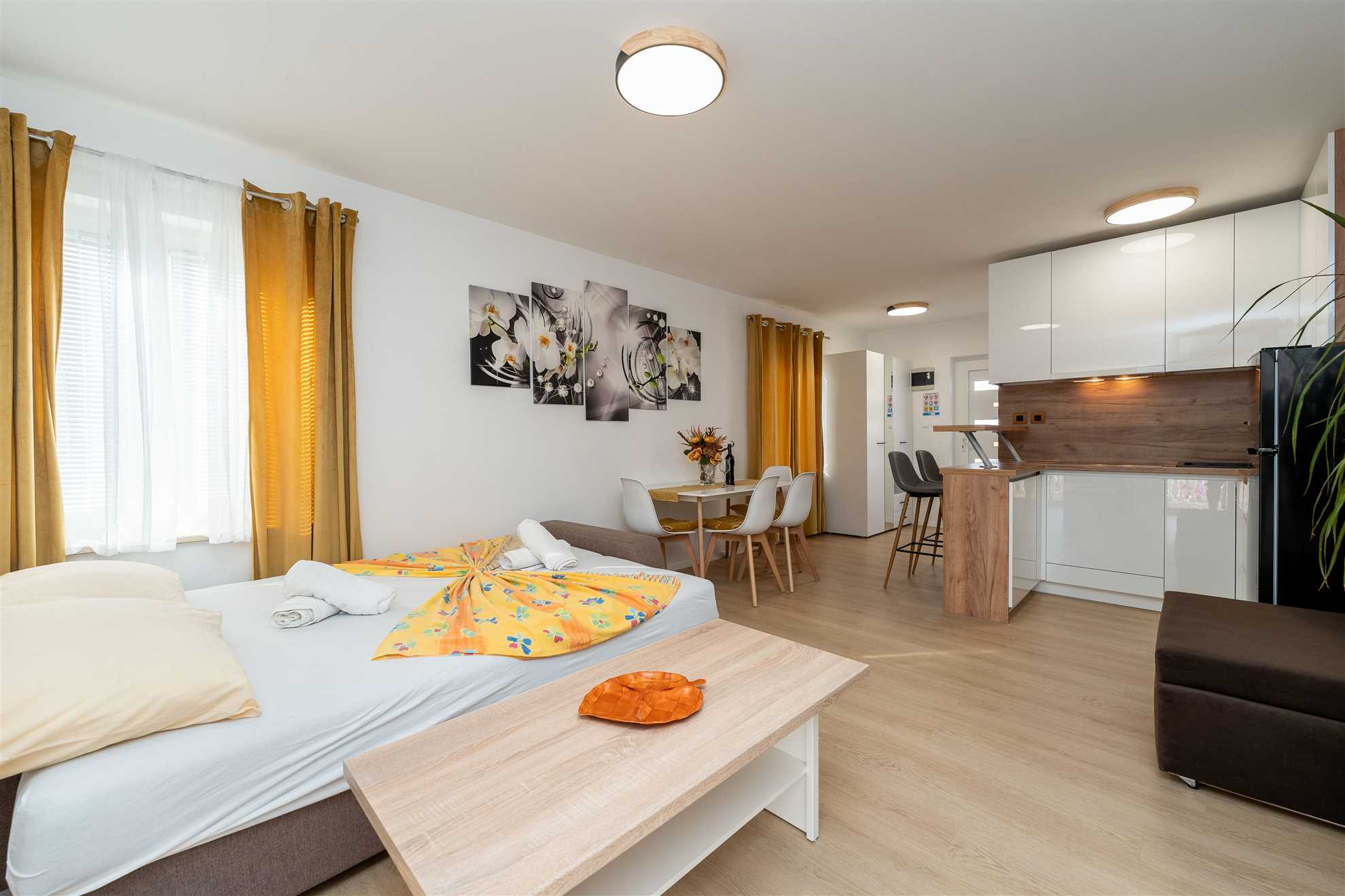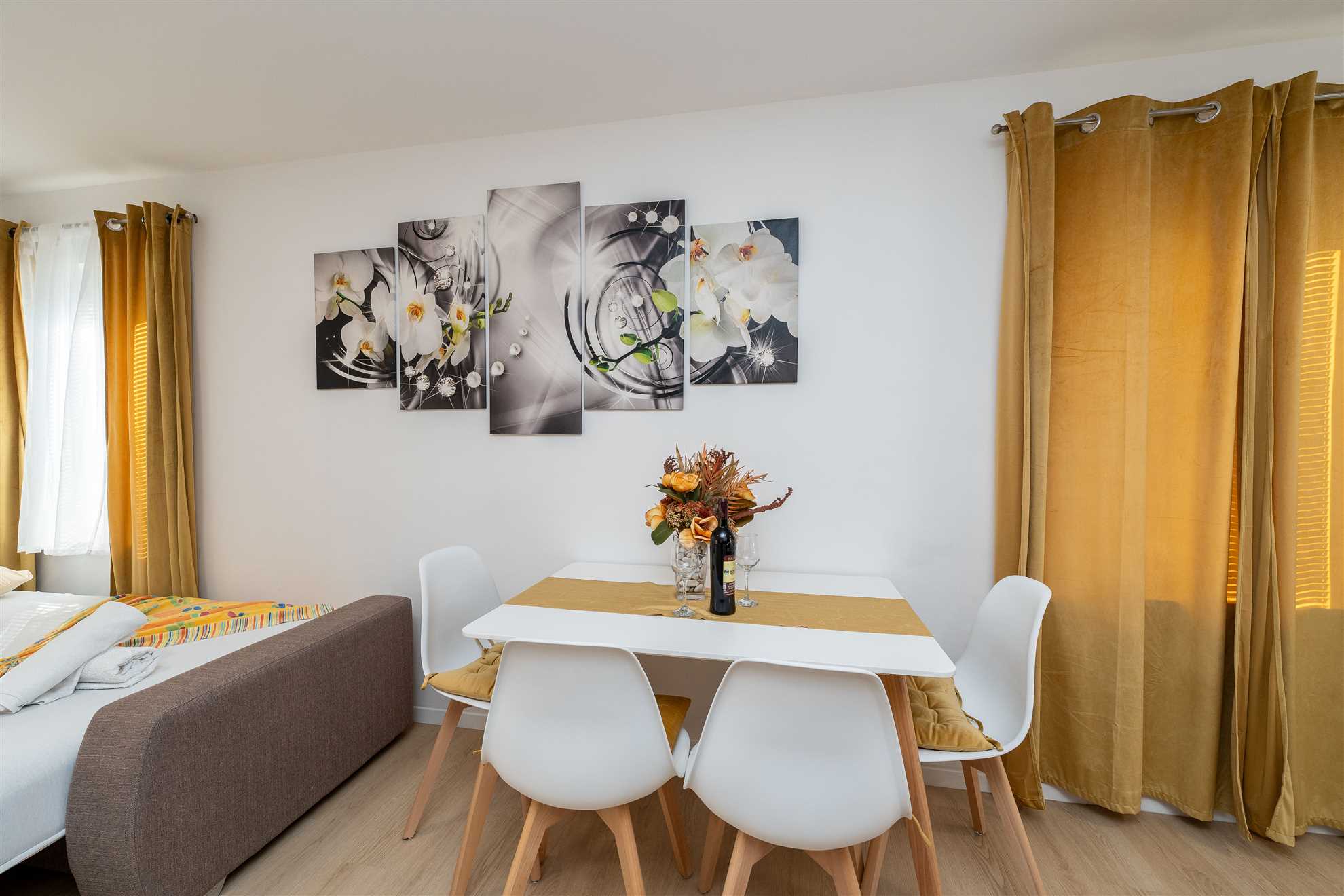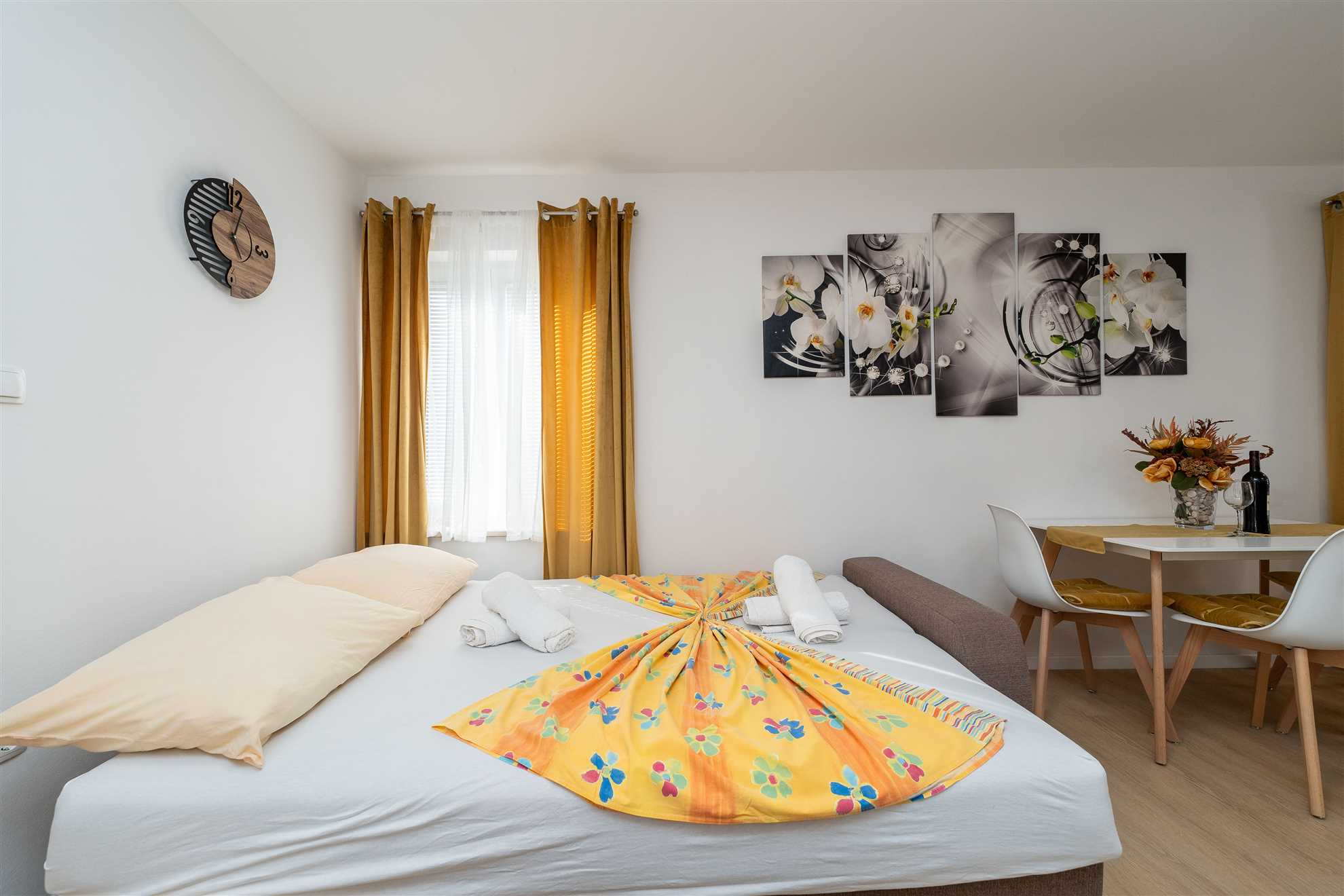 La camera da letto è un santuario di riposo, attrezzato perfettamente per una coppia che cerca un luogo sereno in cui ricaricarsi dopo una giornata avventurosa esplorando la città. La nostra zona giorno favolosamente decorata irradia un'aura di familiarità. Qui troverai tanto spazio per rilassarti e distenderti, magari con un libro o un bicchiere di ottimo vino croato.